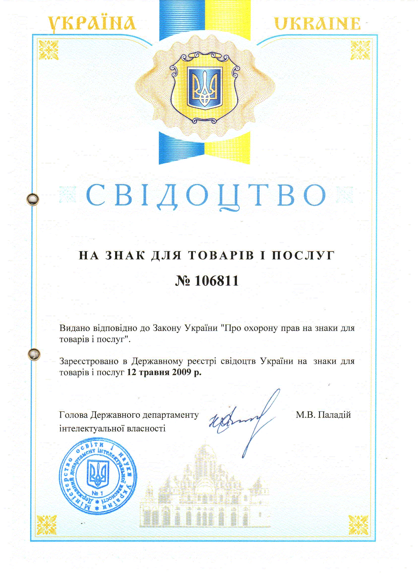 торговой марки является Свидетельство Украины на знак для товаров и услуг